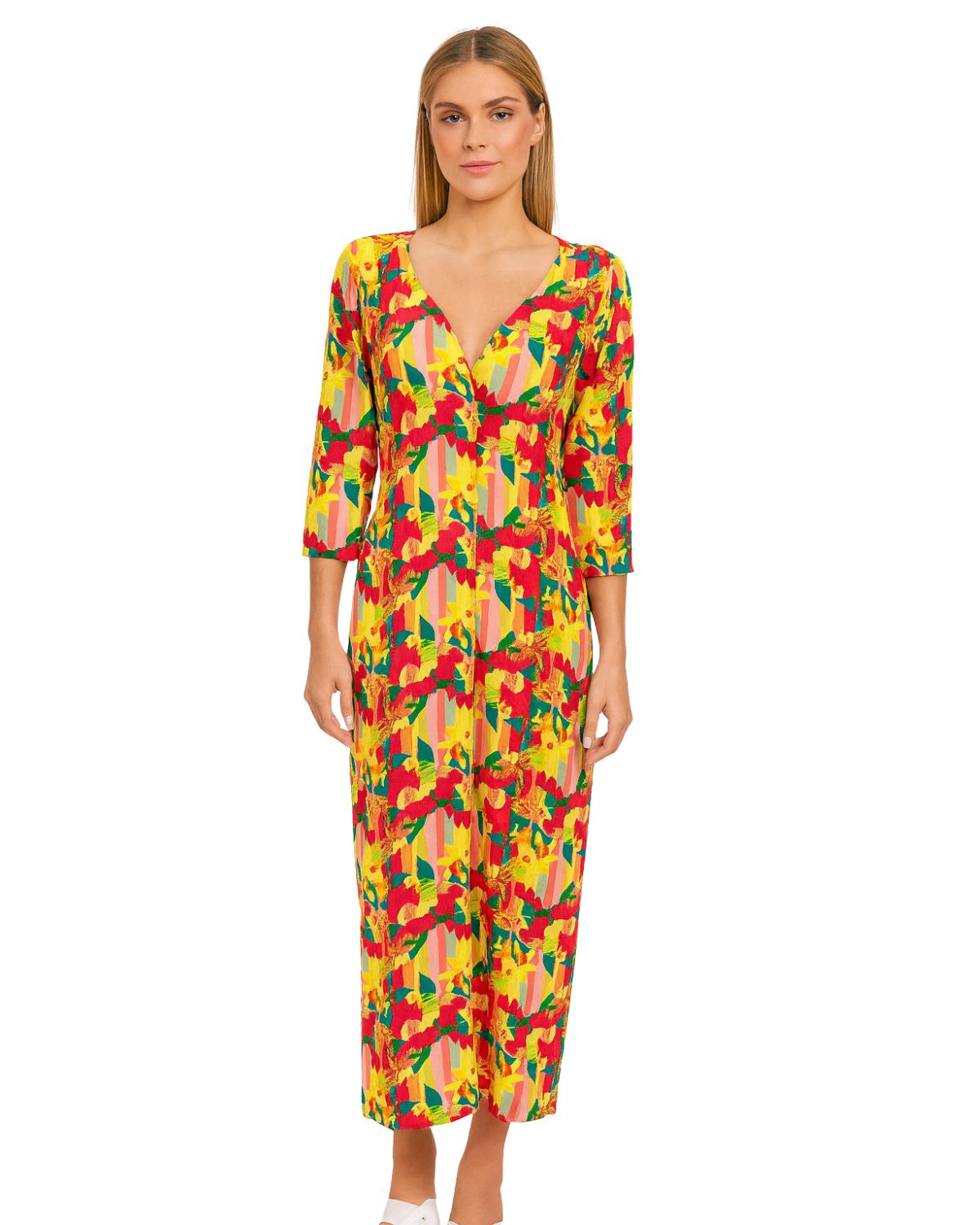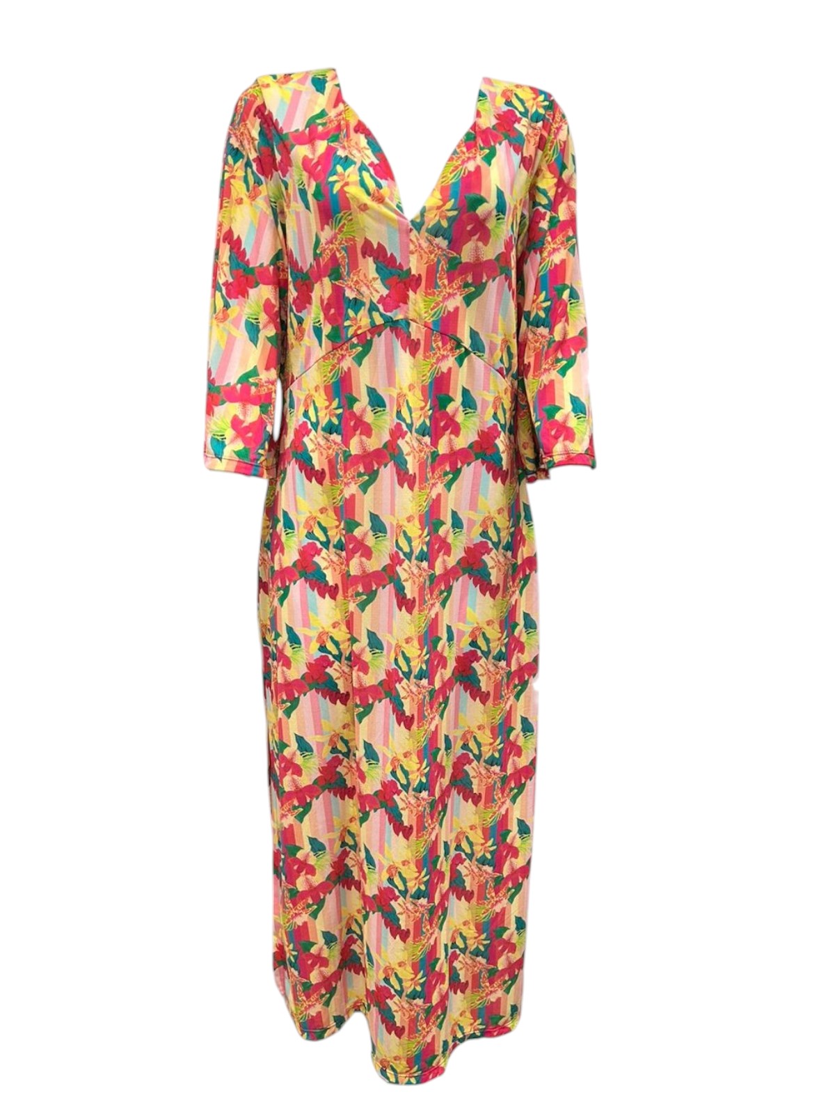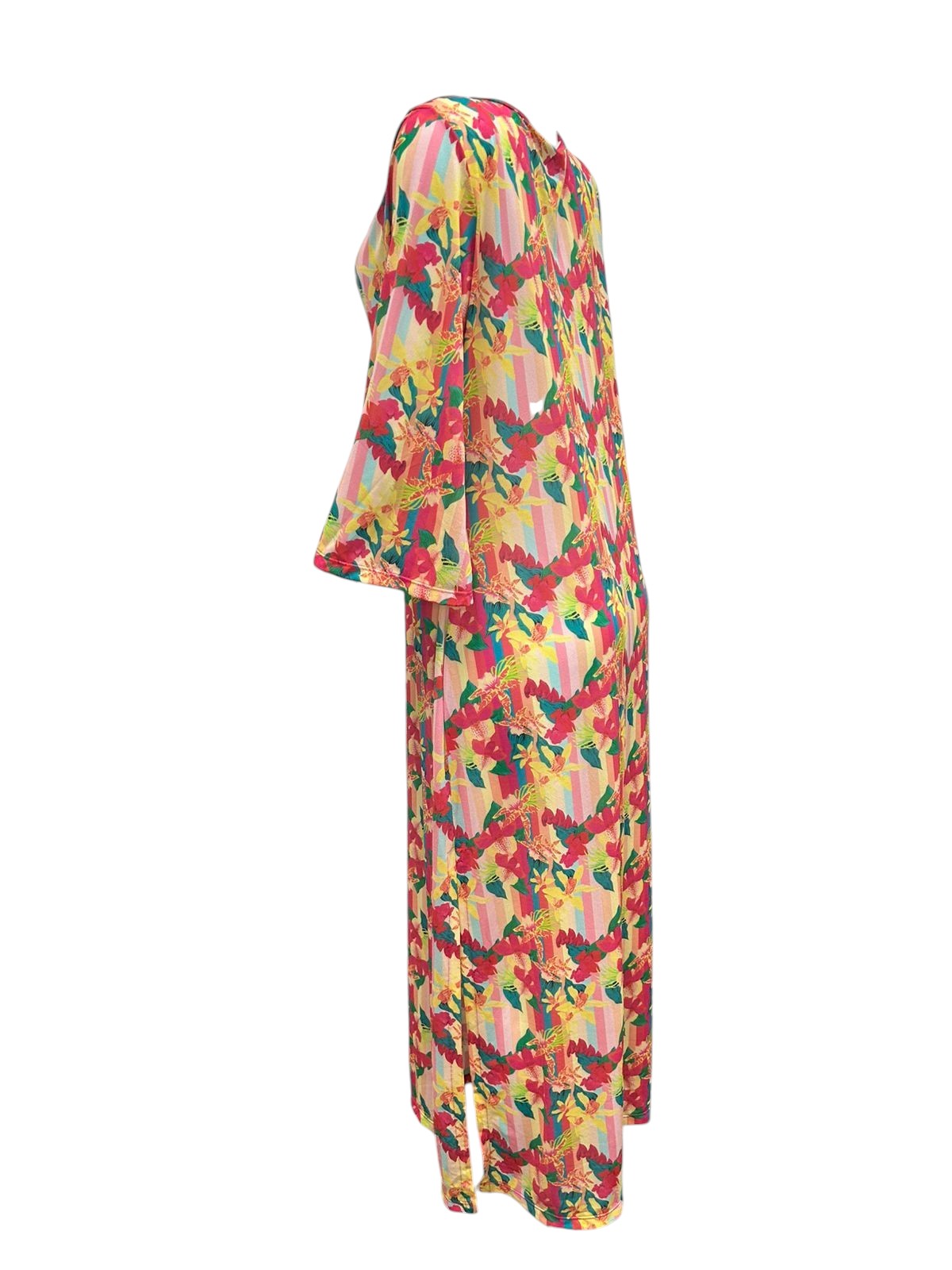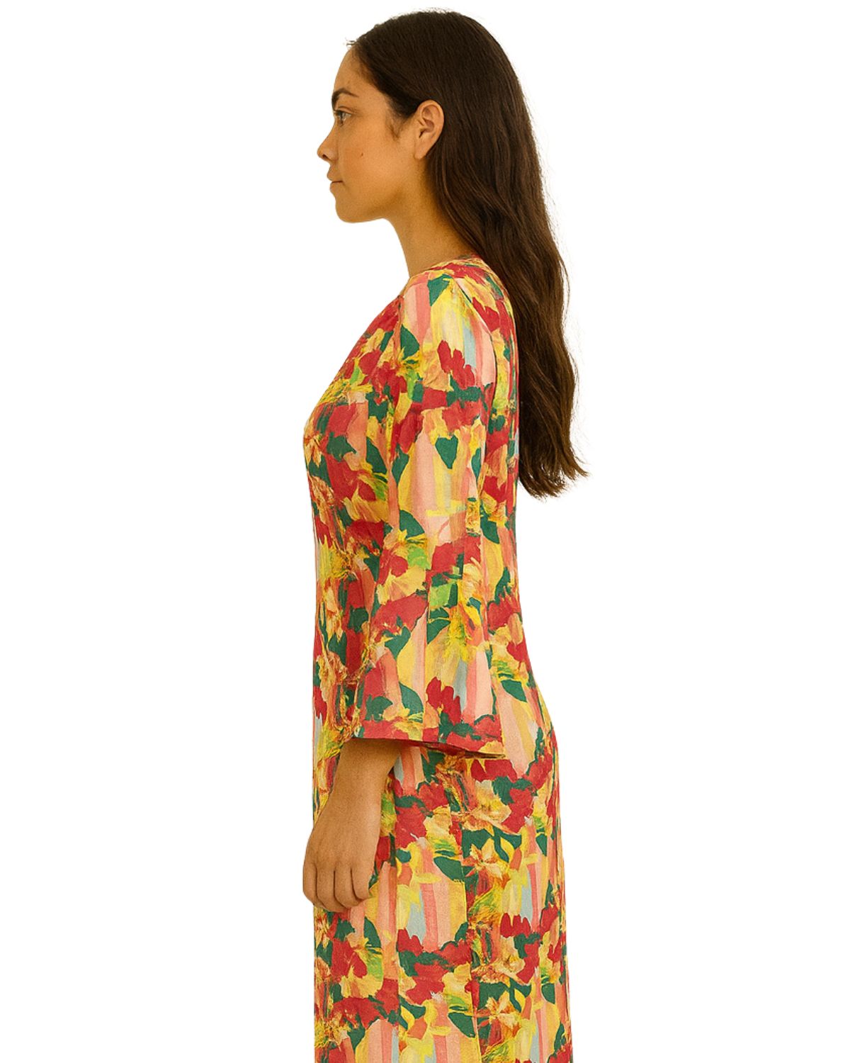 Vestido longo manga 3/4 com fendas laterais, decote V frontal e recortes abaixo do busto. Possui modelagem solta. Confeccionada com tecido fluido com toque macio levemente transparente de secagem rápida. Peça ideal para ser usada também no casual.