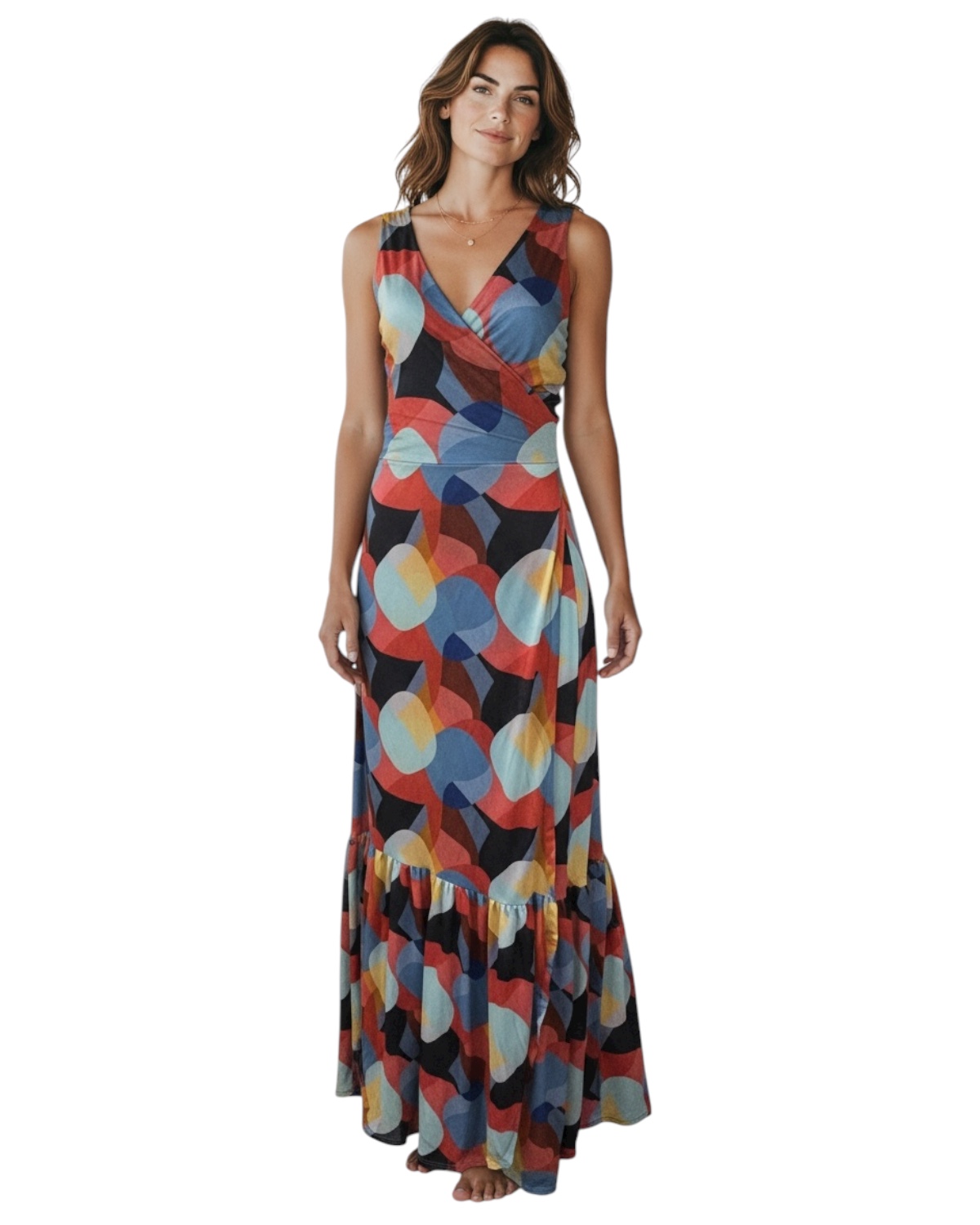 Vestido Longo transpassado com amarração e babado na da saia Sem Manga. Modelo confortável e ajustável ao corpo. Tecido levemente transparente fluido de rápida secagem.