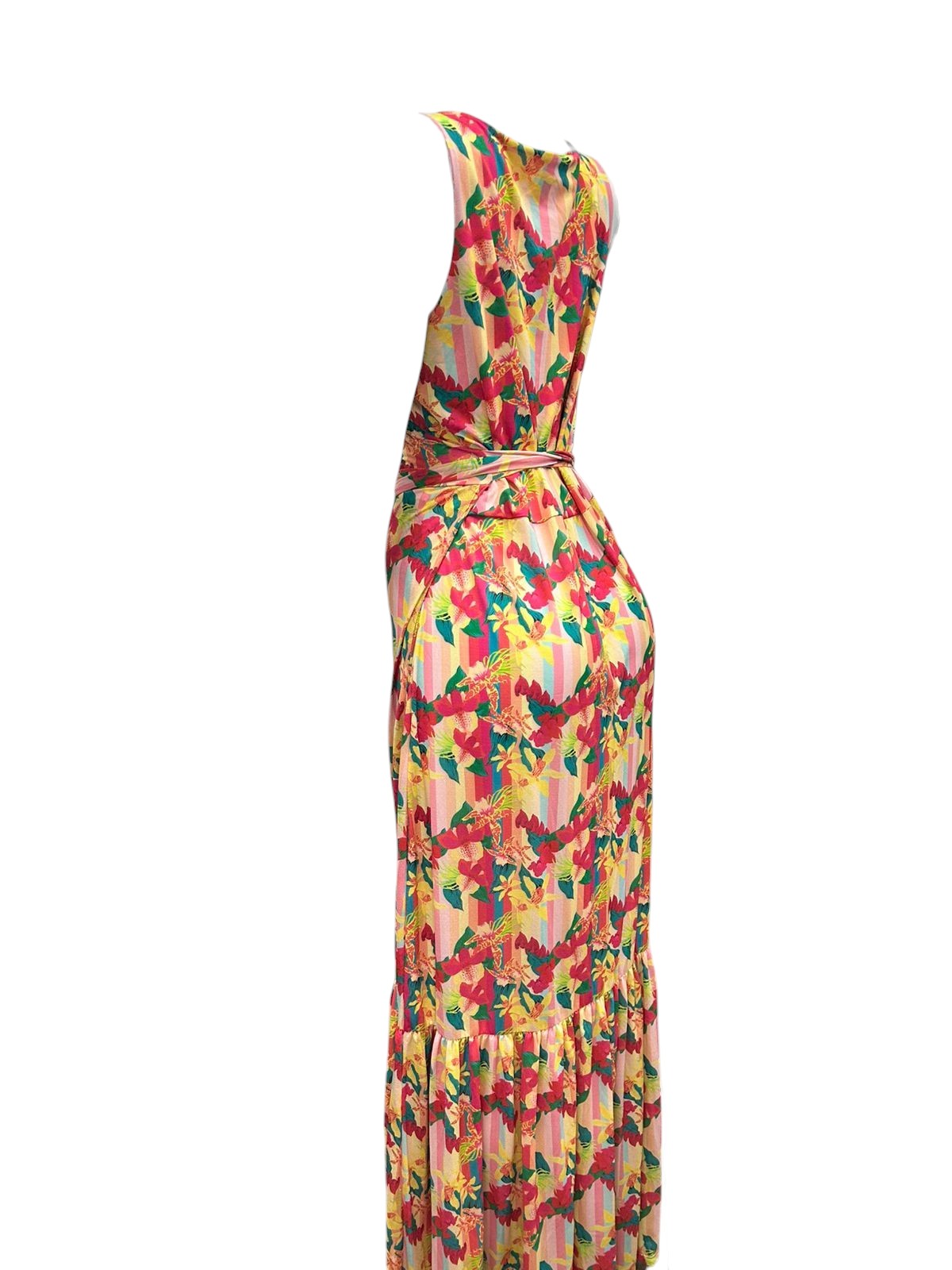 Vestido Longo transpassado com amarração e babado na da saia Sem Manga. Modelo confortável e ajustável ao corpo. Tecido levemente transparente fluido de rápida secagem.